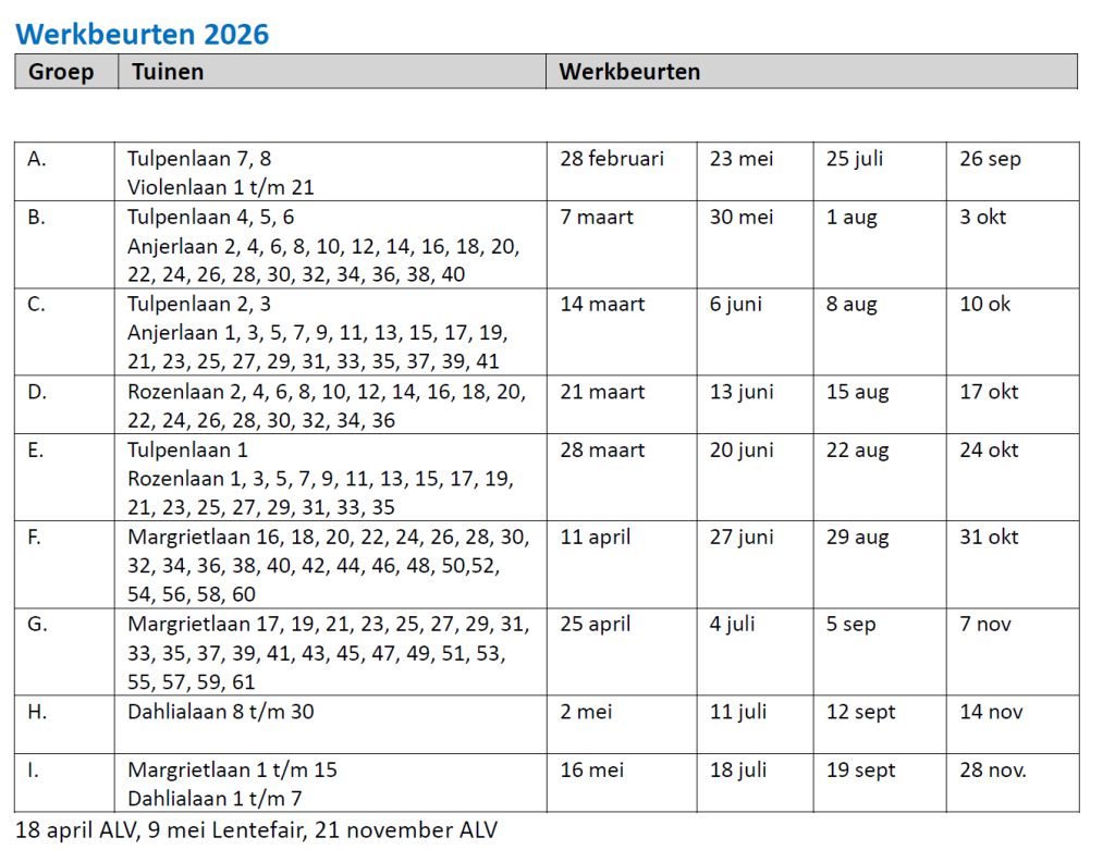 Ook dit jaar staat de teller voor werkbeurten weer op vier. Het bestuur, zal samen met de coördinatoren, de werkzaamheden beter afstemmen op het onderhoudsplan van het complex wat we, samen met de gemeente, vorm aan het geven zijn. Wij vragen jullie daarom de werkbeurten te verrichten op de data dat je ingepland staat. De werkbeurten starten op 28 februari 2026. Het schema staat hieronder in de nieuwsbrief. Uiteraard zullen we het ook op het publicatiebord ophangen. Als een ieder zijn steentje bijdraagt kunnen we ons complex een nog betere uitstraling geven.
